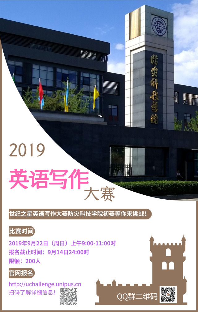 8、参赛培训:2019年5月-11月,大赛组委会将在大赛官网及U讲堂(http://ucourse.unipus.cn)推出针对备赛的系列课程,邀请知名写作专家及往年优秀选手为广大参赛者指点方法、分享心得、交流提高,敬请关注。
