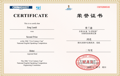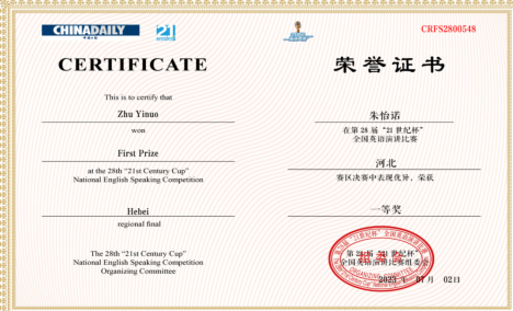 近日,第28届“21世纪杯”全国英语演讲比赛组委会传来喜讯:我校朱怡诺同学(指导教师:赵娟)获得河北赛区一等奖,曾兰迪同学(指导教师:霍雨光)获得河北赛区二等奖。另有46名同学获得校级奖项,获奖名单见附件,自本通知发布之日起,请关注钉钉群通知领取获奖证书。