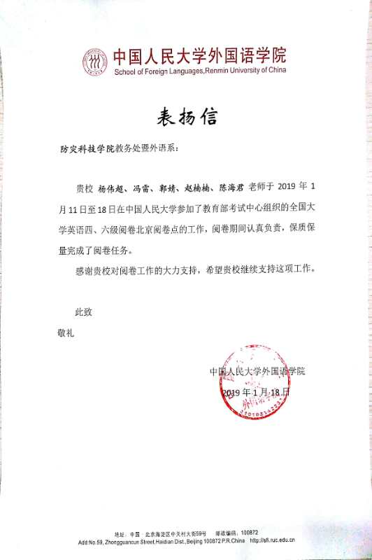 2019年1月11日至18日,由公共英语教研室主任杨伟超老师率队,3003新葡的京集团冯雷、郭婧、赵楠楠、陈海君老师赴中国人民大学参加全国英语四级考试阅卷工作,并圆满完成任务。