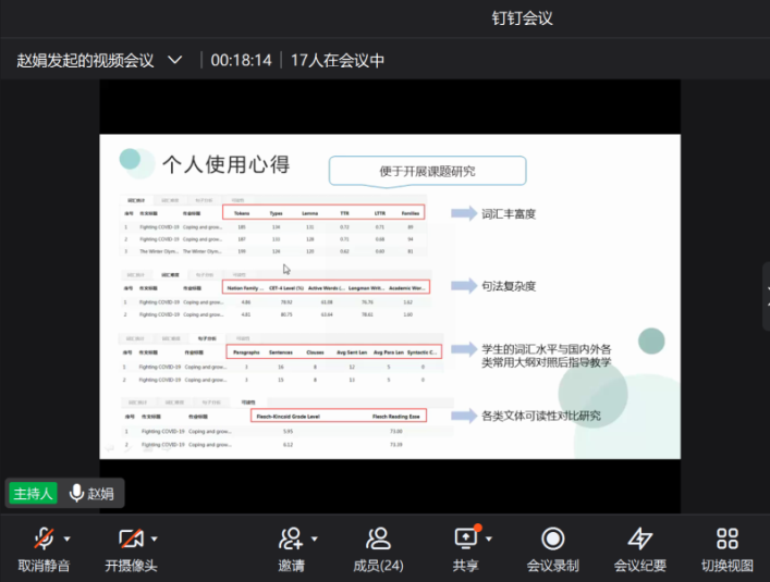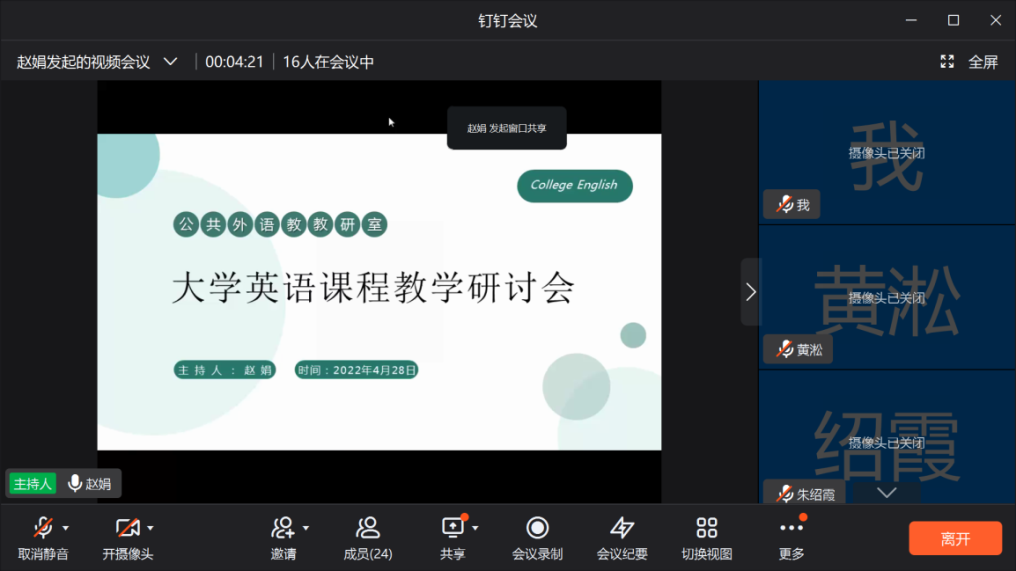 4月28日,新葡的京官网公共外语教研室线上召开2021-2022学年春季学期大学英语课程教学研讨会。本次教学研讨会由教研室主任赵娟主持,教研室全体教师参加,学院副院长韩红梅参加会议。