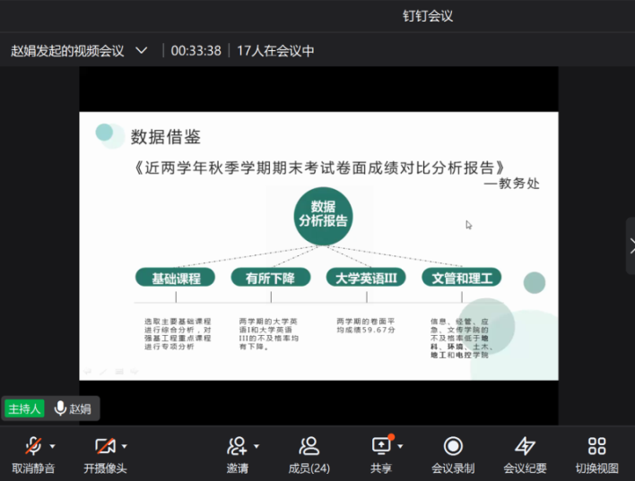 会议主要聚焦以下内容:本学期线上教学情况阶段性总结;iwrite使用情况讨论及任务部署;近两年大学英语期末考试卷面成绩分析和讨论。教研室全体教师对大学英语课程教学情况进行了教学反思,就线上教学中的考勤问题、线上教学应急措施、如何激发学生内生动力、如何有效监控学生自主学习、如何增强师生互动等方面展开了热烈讨论。最后,韩红梅副院长对本次教学研讨会进行指导和总结。