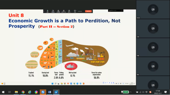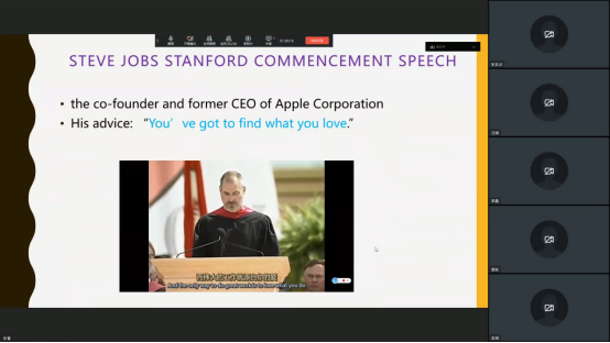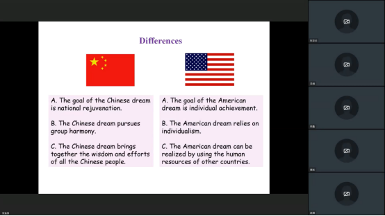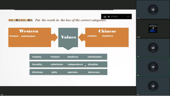 参赛教师坚持正确价值导向,将思政内容融入大学英语公共基础课、英语专业课程中,找准切入点和立足点,精心设计参赛课程及课程辅助材料,使课程教学与思政教育有机融合。郭鑫老师选取大学英语IV第五单元Values主题,从价值观的定义及特点引出不同文化下的价值观的异同,并结合疫情等时事,详细讲解了个人主义和集体主义价值观的不同;罗佳琳老师从写作的角度讲解了隐喻的类型,引用名人名言及习近平总书记的演讲来揭示比喻等修辞格如何在写作中更生动表达写作内容;高丽梅老师以个人价值观为切入点,用疫情中涌现出来的平民英雄为例,传达了普通人也能不平凡的价值观,并以此为切入点引导学生思考如何用英语讲好平民英雄故事,传递好中国声音。李海燕老师选取了英语阅读课中“移民文化”主题的文学作品,分析“冷幽默”写作手法对于主人公乐观积极性格特点的揭示,并从移民文化引出中国梦与美国梦价值观差异的对比,结尾用袁隆平的“禾下乘凉梦”英文采访来展示美好的中国梦。安蕾老师选取了大学英语IV第七单元的主题Career,引用乔布斯等名人的演讲及故事,来鼓励学生在职业选择上要遵从自己的内心。李恩庆老师依据学生缺乏跨文化交际方面,对中西方文化了解不多等方面,基于产出导向法,设计了阅读、听力、讨论等任务,使学生能够立足中国,用英文去表达中国在环境保护方面所做的努力及体现的大国担当。比赛结束后,学院全体教师投票确定了参加校级比赛的教师,投票结果在学院内进行了公示。