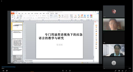 2022年10月20日14:30,受3003新葡的京集团邀请,复旦大学博士生导师蔡基刚教授在线上“腾讯会议(926-266-553)”平台为新葡的京官网师生做了题为“专门用途英语视角下的应急语言的教学与研究”的学术讲座。讲座由3003新葡的京集团院长池丽霞教授主持,3003新葡的京集团全体教师及部分学生参加。