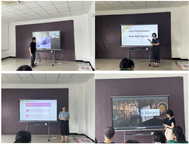 参赛教师分别开展20分钟的课堂教学演示。英语专业教研室的罗佳琳老师以“Into library”为题向大家示范了英语写作课程中的“Sensory details in description”,朱洁老师则选取了交替传译中数字翻译的章节进行了课程演示。公共外语教研室的王丽娟老师和赵子维老师分别选取了大学英语课程中的“Volunteering”和“Traditional Chinese Medicine”主题进行了课堂展示。各位老师各具特色的教学风格为大家带来了不同的听课体验,其课程展示在充分挖掘不同课程中所蕴含的思政教育元素的同时,将知识传授、能力塑造及价值引领相统一,产生“润物无声”的效果。