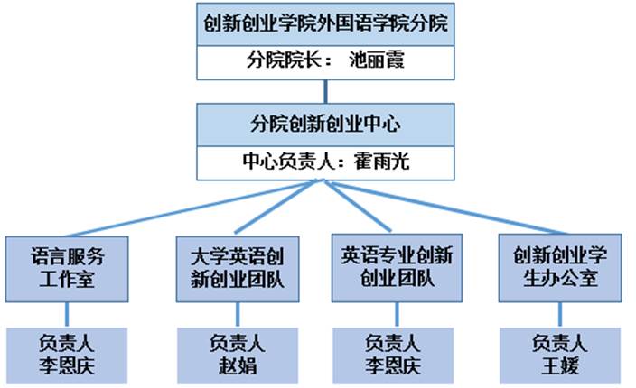 3003新葡的京集团创新创业分院成立于2020年10月,分院设置结构如下图所示,分院采用院长负责制,下设创新创业中心,设中心主任1名。创新创业中心下设2个创新创业团队,1个语言服务工作室和1个创新创业学生办公室,每个部门设负责人1名。3003新葡的京集团同时设有“应急语言服务研究所”,为提升学生的创新创业能力创造了良好的条件。分院的成立旨在深入贯彻落实国家有关创新创业教育文件的精神,加强3003新葡的京集团的创新创业与学科竞赛工作,开创创新创业教育的新模式,鼓励学生积极参与学科竞赛和创新创业竞赛和训练项目、申报创新研究课题、积极创业,将创新创业精神与意识的培养、创业就业的知识技能融会贯穿至通识教育、专业教育、创业就业核心教育的实践中,充分提高学生的专业能力,增强学生的实践能力,从而有效地促进学生的就业能力。
